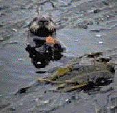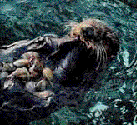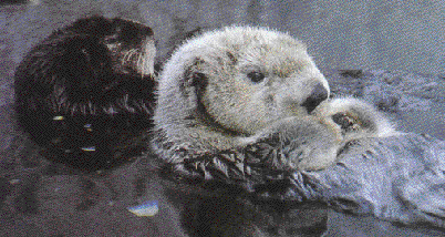 Sea otters eat shellfish such as clams and abalone. They lie on their backs and pound the shells with rocks, using their flat chests as tables. Every day an adult sea otter may eat up to 30% of its own body weight. Sea otters are mammals, marine mammals, but mammals all the same, so pups need milk to survive. They are born with fur that holds so much air that they can not even dive for food. They take extra good care of their pups. Mother otters usually spend hours grooming their pups and carrying them around on their chests. Even though twins are not unheard of, usually there is only one pup. The gestation period is usually 4-5 months and pups can be born all year (however are usually born in February).